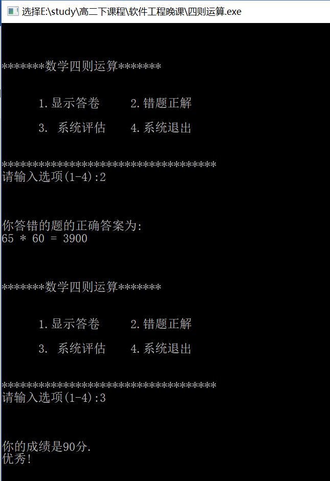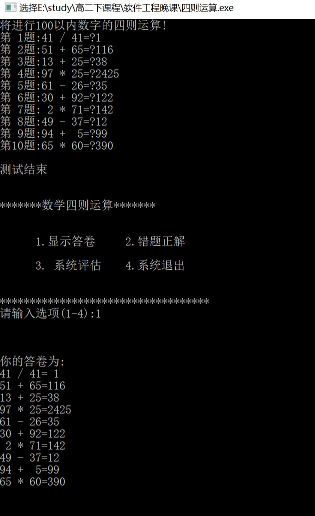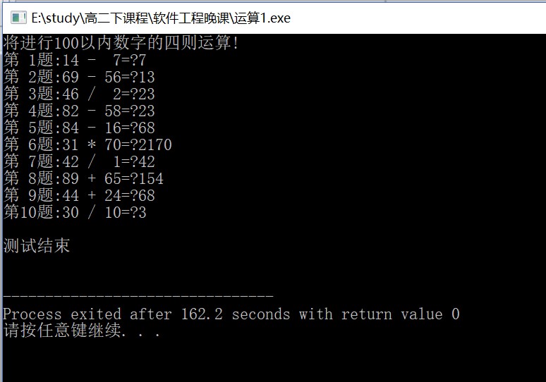 1 #include"stdio.h" 2 #include<stdlib.h> 3 #include<time.h> 4 #include<ctype.h> 5 6 int sy[10],sr[10],jd[10],jg[10]; 7 int fs=0; 8 char fh[10]; 9 void chufa(int *s1,int *s2,int *s3) 10 { 11 int i,b=1,c,jg; 12 int cs[20]={0},sy,sr; 13 srand((unsigned)time(NULL)); 14 FA:sy=rand()%100; 15 if(sy==0) goto FA; 16 for(i=1;i<=sy;i++) 17 { 18 if(sy%i==0) { cs[b]=i; b++;} 19 else continue; 20 } 21 c=rand()%b; 22 if(c==0) c=c+1; 23 sr=cs[c]; 24 jg=sy/sr; 25 *s1=sy; 26 *s2=sr; 27 *s3=jg; 28 } 29 void jisuan() 30 { 31 int p; 32 int i,gh; 33 printf("将进行100以内数字的四则运算!\n"); 34 srand((unsigned)time(NULL)); 35 36 for(i=0;i<10;i++) 37 { 38 sy[i]=rand()%100; 39 sr[i]=rand()%100; 40 p=rand()%4; 41 42 if(p==0) 43 { 44 fh[i]='+';jg[i]=sy[i]+sr[i];} 45 else if(p==1) 46 { 47 fh[i]='-'; 48 if(sy[i]<sr[i]) 49 { gh=sy[i]; 50 sy[i]=sr[i]; 51 sr[i]=gh; 52 } 53 jg[i]=sy[i]-sr[i]; 54 } 55 else if(p==2) 56 { 57 fh[i]='*'; 58 jg[i]=sy[i]*sr[i]; 59 } 60 else if(p==3) 61 { 62 fh[i]='/'; 63 chufa(&sy[i],&sr[i],&jg[i]); 64 } 65 printf("第%2d题:%2d %c %2d=?",i+1,sy[i],fh[i],sr[i]); 66 scanf("%d",&jd[i]); 67 if(jd[i]==jg[i]) fs+=10; 68 } 69 printf("\n测试结束\n\n"); 70 } 71 int main() 72 { 73 jisuan(); 74 return 0; 75 }