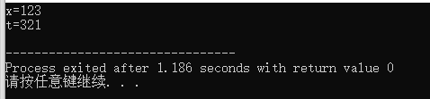 #include <stdio.h> int main() { int x,t,m; x=123; printf("x=%d\n",x); t=0; m =x%10; t =t *10+m; x= x/10; m =x%10; t =t *10+m; x= x/10; m =x%10; t =t *10+m; x= x/10; printf("t=%d\n",t); return 0; }