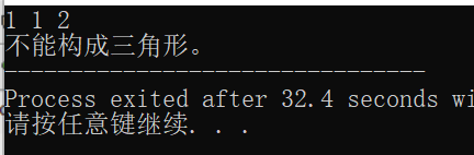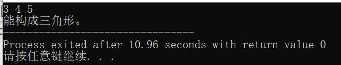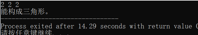 #include <stdio.h> int main() { float a,b,c; scanf("%f%f%f",&a,&b,&c); if(a+b>c && a+c>b && b+c>a) printf("能构成三角形。"); else printf("不能构成三角形。"); return 0; }