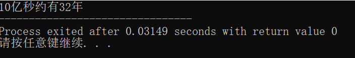 #include <stdio.h> int main() { int year; year = (int) (1e9/(365*24*60*60)+0.5); printf("10亿秒约有%d年",year); return 0; }