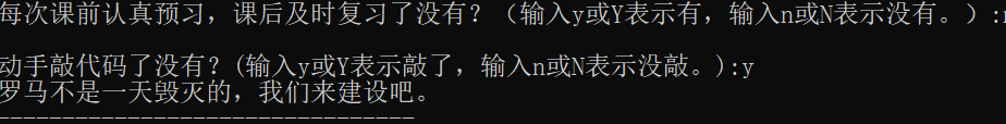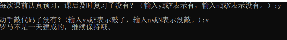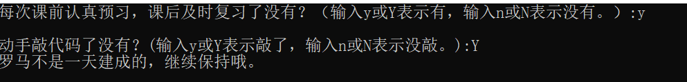 #include <stdio.h> int main() { char ans1, ans2; printf("每次课前认真预习,课后及时复习了没有?(输入y或Y表示有,输入n或N表示没有。):"); ans1 = getchar(); getchar(); printf("\n动手敲代码了没有?(输入y或Y表示敲了,输入n或N表示没敲。):"); ans2 = getchar(); if(ans1=='y'&&ans2=='y'||ans1=='y'&&ans2=='Y'||ans1=='Y'&&ans2=='y'||ans1=='Y'&&ans2=='Y') printf("罗马不是一天建成的,继续保持哦。\n"); else printf("罗马不是一天毁灭的,我们来建设吧。"); return 0; }