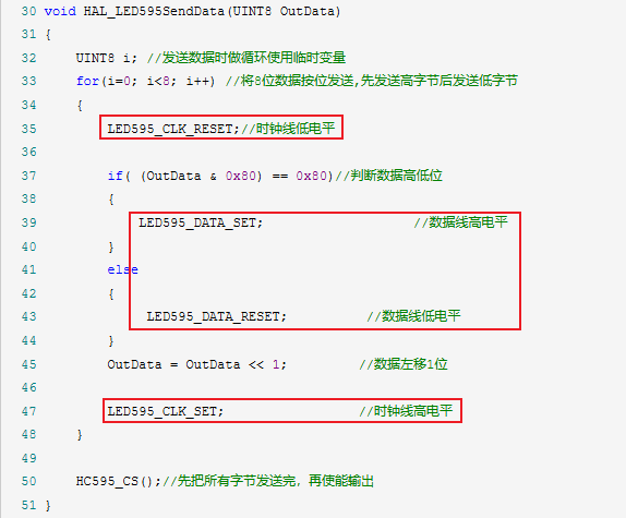 1 //用于数码管的中断刷新显示 2 void led595_displayPro( void ) 3 { 4 led595_flush_flag = !led595_flush_flag; 5 6 LED595_CS1_RESET(); 7 LED595_CS2_RESET(); 8 9 delay_us(HC595_DELAY_CNT); 10 11 HAL_LED595SendData( led595_display_buf[led595_flush_flag] ); 12 13 if ( led595_flush_flag ) 14 { 15 LED595_CS2_SET(); 16 } 17 else 18 { 19 LED595_CS1_SET(); 20 } 21 delay_us(HC595_DELAY_CNT); 22 23 return; 24 } 25 26 27 void HAL_LED595SendData( UINT16 OutData ) 28 { 29 for ( UINT8 i = 0; i < 8; i++ ) //将8位数据按位发送,先发送高字节后发送低字节 30 { 31 if ( ( OutData & ( 1 << ( 7 - i ) ) ) )//判断数据高低位 32 { 33 LED595_DATA_SET; //数据线高电平 34 } 35 else 36 { 37 LED595_DATA_RESET; //数据线低电平 38 } 39 40 LED595_CLK_SET; //时钟线高电平 41 delay_us(HC595_DELAY_CNT); 42 LED595_CLK_RESET;//时钟线低电平 43 delay_us(HC595_DELAY_CNT); 44 } 45 46 HC595_CS();//锁存 47 48 return; 49 }
