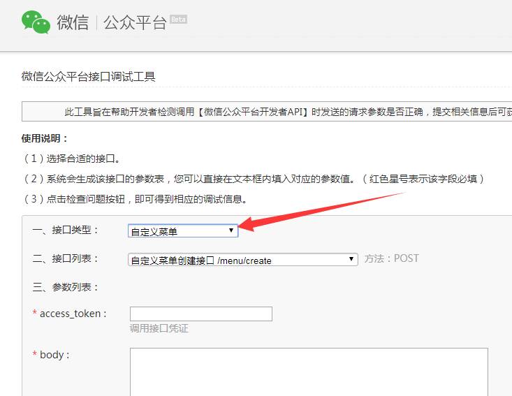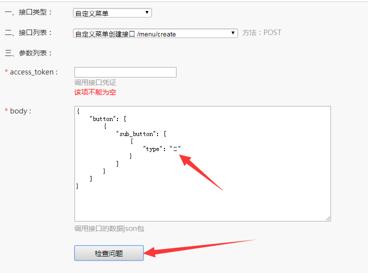 3、在body区,拷贝进入如下代码{"button":[{"sub_button":[{"type":"\ue112"}]}]} ,其中\ue112就是你需要的emoji表情编码,如果需要其他表情,找到表情编码替换就好。