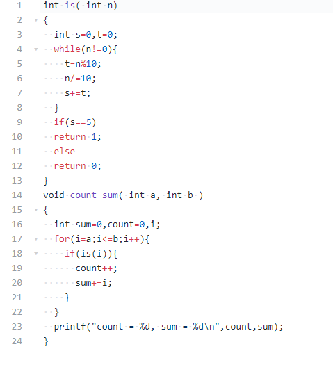 函数count_sum利用函数is统计给定区间[a, b]内有多少个满足上述要求(即令is返回1)的整数,并计算这些整数的和。最后按照格式