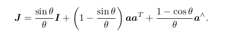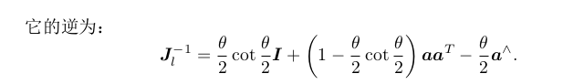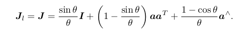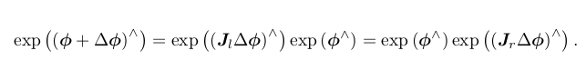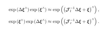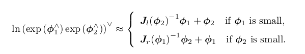 该式告诉我们,当对一个旋转矩阵 R 2 (李代数为 φ2 )左乘一个微小旋转矩阵 R 1 (李代数为 φ 1 )时,可以近似地看作,在原有的李代数 φ 2 上,加上了一项 J l (φ 2 )−1φ 1 。同理,第二个近似描述了右乘一个微小位移的情况。于是,李代数在 BCH近似下,分成了左乘近似和右乘近似两种,在使用时我们须加注意,使用的是左乘模型还是右乘模型。
