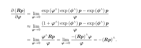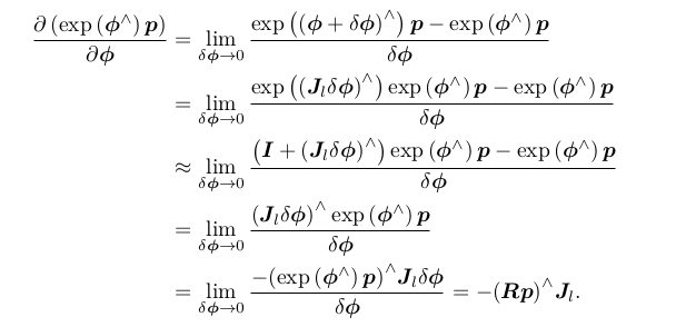 我们以左扰动为例。设左扰动 ∆R 对应的李代数为φ。然后,对 φ 求导,即: