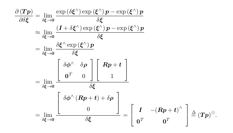 假设某空间点 p 经过一次变换 T (对应李代数为 ξ),得到 T p ¬ 。现在,给 T 左乘一个扰动