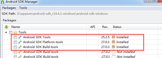 打开解压后的SDK文件夹,点击SDK Manager,安装Tools下的Android SDK Platform-tools和Android SDK Build-tools,Android SDK Tools可以选择是否更新,建议直接更新。镜像:随便选个版本也可以选择多个版本安装,由于镜像比较大,所以喜欢真机的可以不下载镜像,