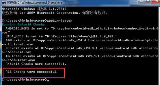 cmd打开命令行窗口,输入appium-doctor ,出现以下提示,All Checks were successful ,说明环境配置成功。