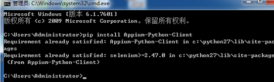 cmd打开命令行窗口,输入:pip install Appium-Python-Client,提示成功就可以了,我这边是已经安装过了。