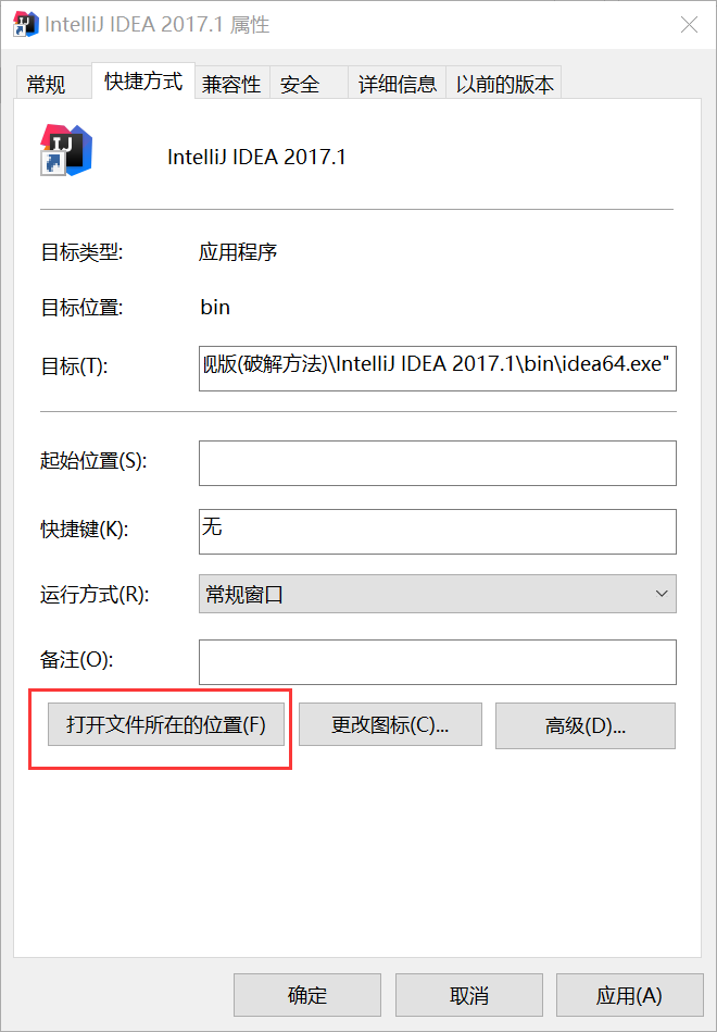 第二步:找到idea的安装目录(如果不知道可以:右键>>属性>>打开文件所在位置)