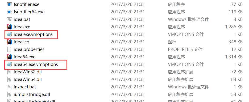 然后回到idea的安装目录,找到“idea64.exe.vmoptions”和“idea.exe.vmoptions”两个文件