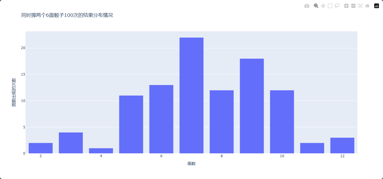 本文主要讲述使用Python的Plotly绘图库绘制掷2个6面骰子多次后其结果之和的直方图结果