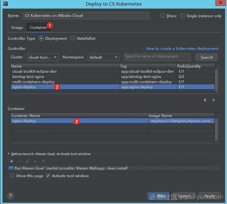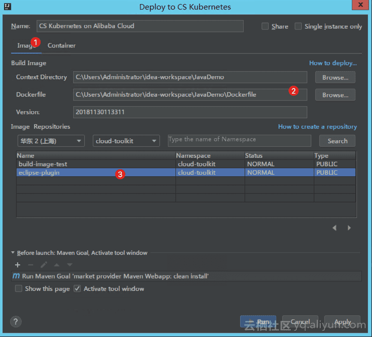 在 Intellij IDEA 中,鼠标右键项目工程名,在出现的菜单中点击 Alibaba Cloud --> Deploy to CS Kubernetes...,出现如下部署窗口:
