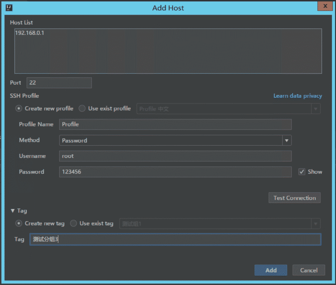 点击:右上角 Add Host 按钮,出现添加机器界面,如下图,设置相关配置。