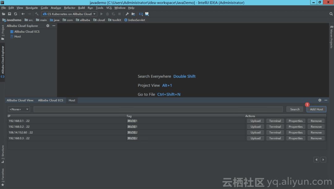 点击:顶部菜单 Tools --> Alibaba Cloud --> Alibaba Cloud View --> Host ,打开机器视图界面,如下图: