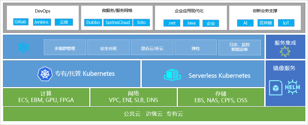 容器服务 K8s 是基于原生 K8s 进行适配和增强,简化集群的搭建和扩容等工作,提供高性能可伸缩的容器应用管理能力,支持企业级容器化应用的全生命周期管理,整合阿里云虚拟化、存储、网络和安全能力,打造云端最佳容器化应用运行环境。其中的核心功能为:
