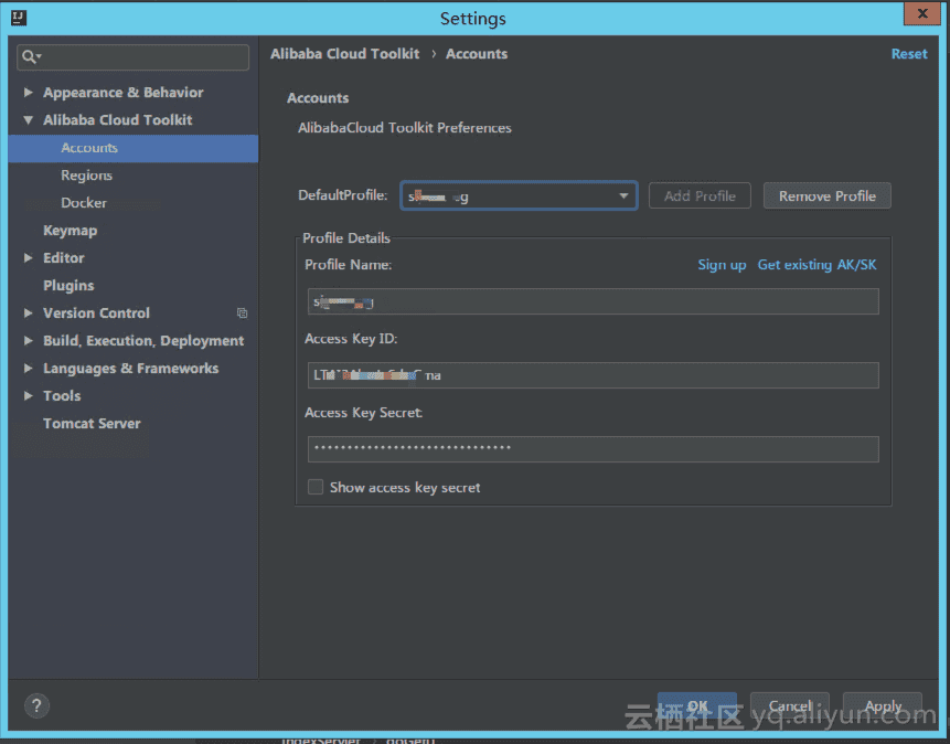 点击:顶部菜单Tools --> Alibaba Cloud Toolkit --> Preferences-->左边列表的 Alibaba Cloud Toolkit--> Accounts ,出现如下界面,配置阿里云账号的 AK 和 SK,即可完成首选项配置。(如果是子账号,则填写子账号的 AK 和 SK)