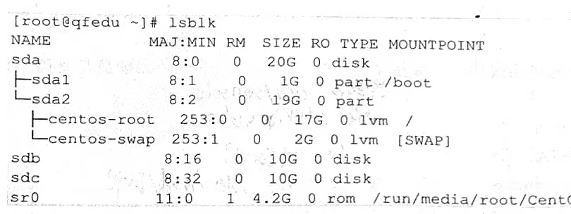在虚拟机上为系统添加两块 10GiB 虚拟硬盘 sdb与sdc,使用lsblk命令查看新添加的两块硬盘,具体如下所示。