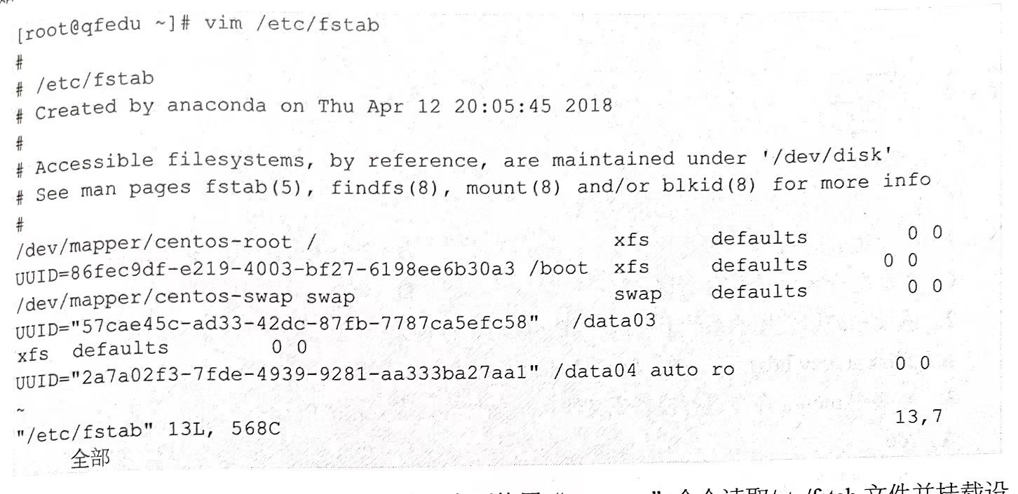 在/etc/fstab配置文件中写入设备的UUID,其中sdc1分区的挂载点为data03,文件系统类型为xfs,挂载选项为defaults,最后两个数字为0,表示不备份、不检测;sdc5分区的挂载点为data04,文件系统类型为auto(自动),挂载选项为ro(只读),最后两个数字为0,表示不备份、不检测,具体如下所示。