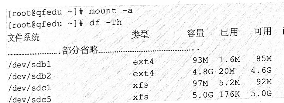 重新启动系统就可以读取新挂载的设备,也可使用"mount-a"命令读取/etc/fstab文件并挂载设备。使用df 命令查看已挂载设备信息,添加"T"参数可显示设备文件的类型,添加"h"参数可显示设备大小。具体如下所示。