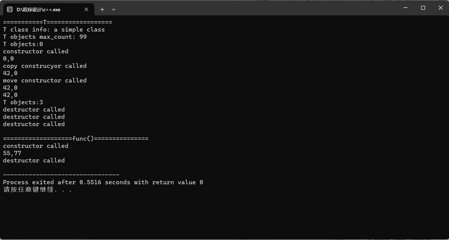 1 #include "t1.h" 2 void test() 3 { 4 cout << "T class info: " << T::doc << endl; 5 cout << "T objects max_count: " << T::max_count << endl; 6 T::disply_count(); 7 T t1; 8 t1.display(); 9 t1.set_m1(42); 10 T t2{t1}; 11 t2.display(); 12 T t3{std::move(t1)}; 13 t3.display(); 14 t1.display(); 15 T::disply_count(); 16 } 17 int main() 18 { 19 cout<<"===========T=================="<<endl; 20 test(); 21 cout<<endl; 22 cout<<"===================func()==============="<<endl; 23 func(); 24 }