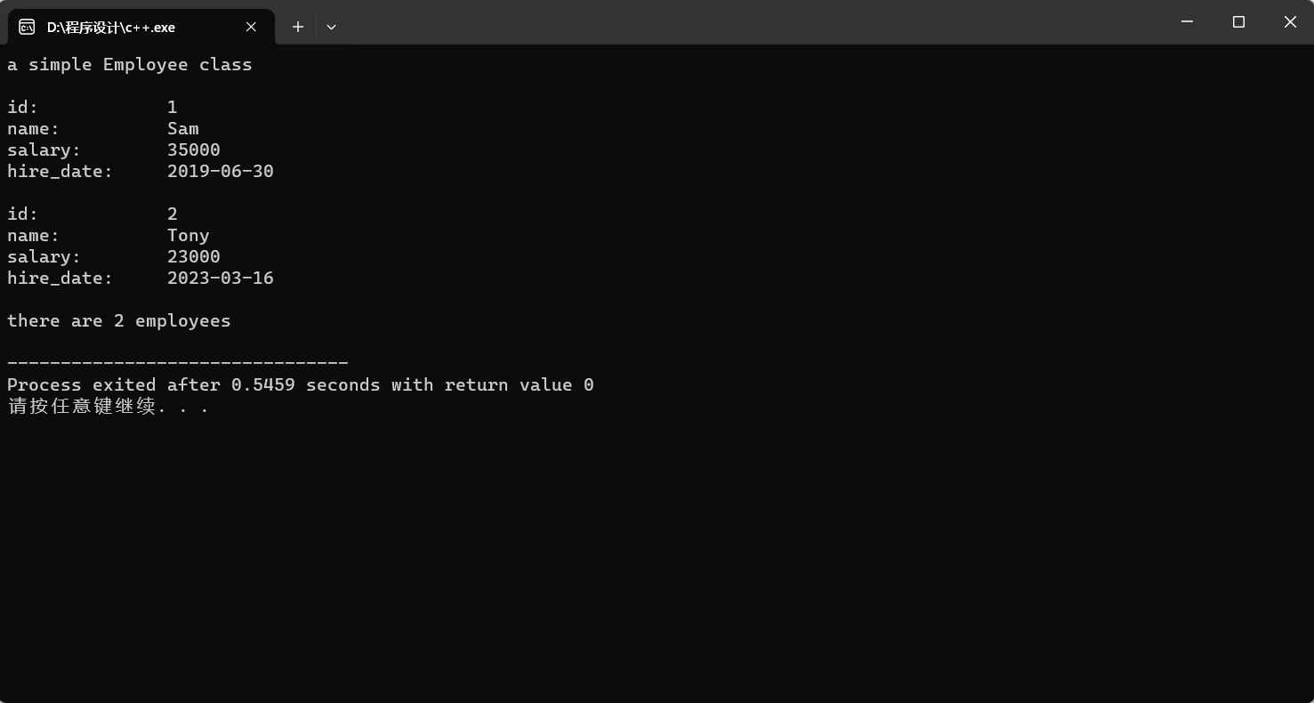 1 #include "Employee.h" 2 #include <iostream> 3 void test() 4 { 5 using std::cout; 6 using std::endl; 7 cout << Employee::doc << endl << endl; 8 Employee employee1; 9 employee1.set_info("Sam", 30000, 2015, 1, 6); 10 employee1.update_hire_date(2019, 6, 30); 11 employee1.update_salary(35000); 12 employee1.display_info(); 13 cout << endl << endl; 14 Employee employee2{"Tony", 20000, 2023, 3, 16}; 15 employee2.raise_salary(15); 16 employee2.display_info(); 17 cout << endl << endl; 18 Employee::display_count(); 19 } 20 int main() 21 { 22 test(); 23 }