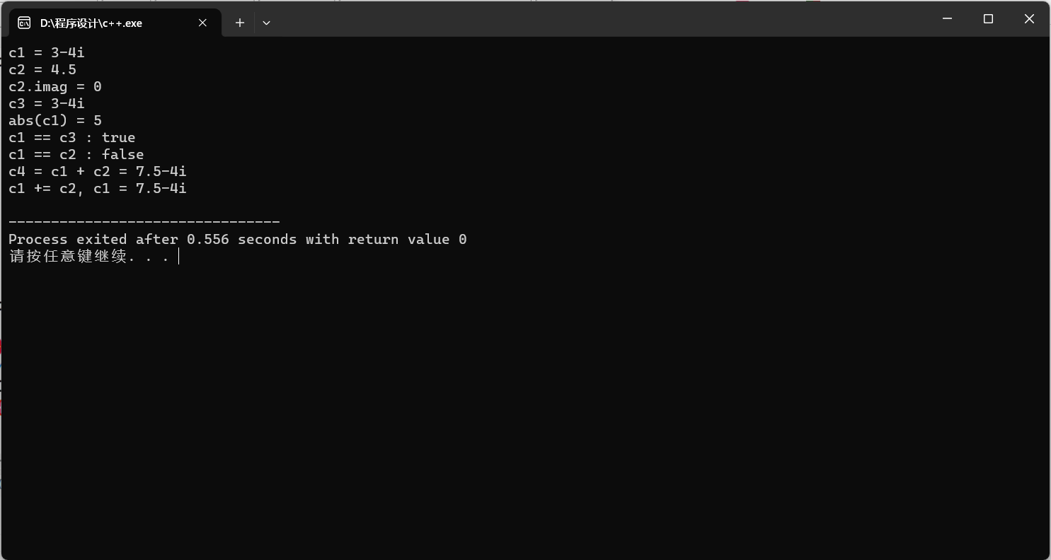 1 #include "complex.cpp" 2 void test() 3 { 4 using namespace std; 5 Complex c1(3, -4); 6 const Complex c2(4.5); 7 Complex c3(c1); 8 cout << "c1 = "; 9 c1.show(); 10 cout << endl; 11 cout << "c2 = "; 12 c2.show(); 13 cout << endl; 14 cout << "c2.imag = " << c2.get_imag() << endl; 15 cout << "c3 = "; 16 c3.show(); 17 cout << endl; 18 cout << "abs(c1) = "; 19 cout << abs(c1) << endl; 20 cout << boolalpha; 21 cout << "c1 == c3 : " << is_equal(c1, c3) << endl; 22 cout << "c1 == c2 : " << is_equal(c1, c2) << endl; 23 Complex c4; 24 c4 = add(c1, c2); 25 cout << "c4 = c1 + c2 = "; 26 c4.show(); 27 cout << endl; 28 c1.add(c2); 29 cout << "c1 += c2, " << "c1 = "; 30 c1.show(); 31 cout << endl; 32 } 33 int main() 34 { 35 test(); 36 }