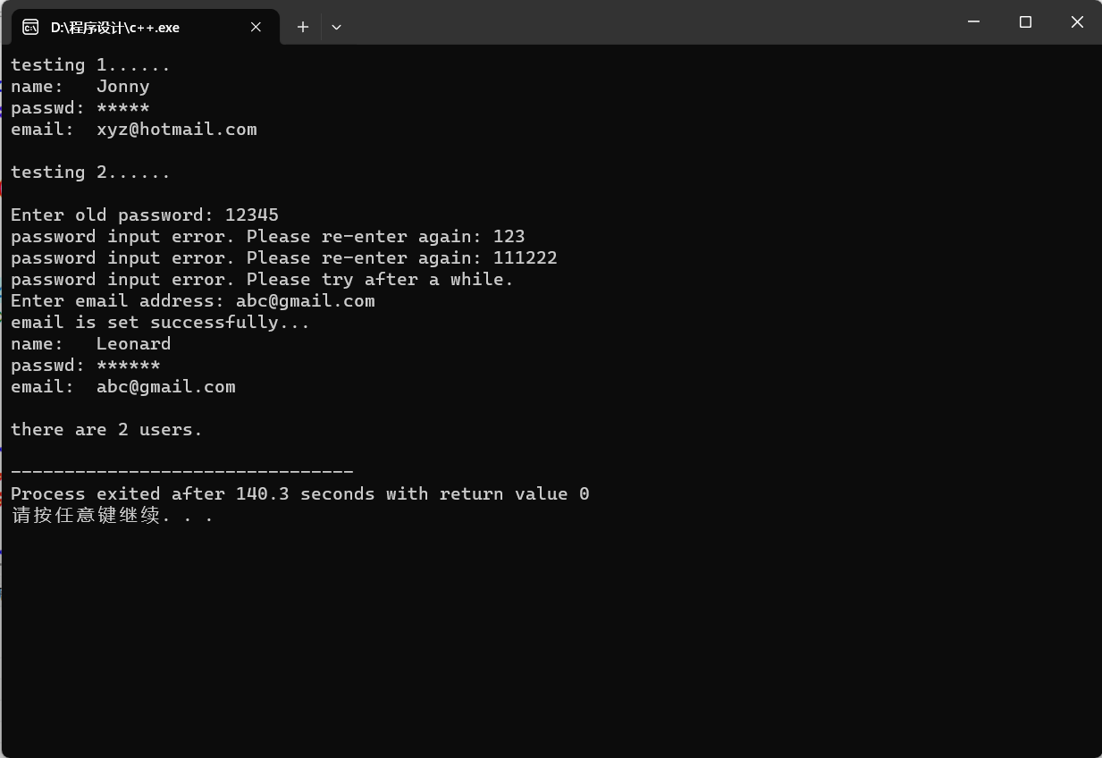 1 #include "User.hpp" 2 #include <iostream> 3 4 void test() { 5 using std::cout; 6 using std::endl; 7 cout << "testing 1......\n"; 8 User user1("Jonny", "92197", "xyz@hotmail.com"); 9 user1.print_info(); 10 cout << endl 11 << "testing 2......\n\n"; 12 User user2("Leonard"); 13 user2.change_passwd(); 14 user2.set_email(); 15 user2.print_info(); 16 cout << endl; 17 User::print_n(); 18 } 19 int main() { 20 test(); 21 }