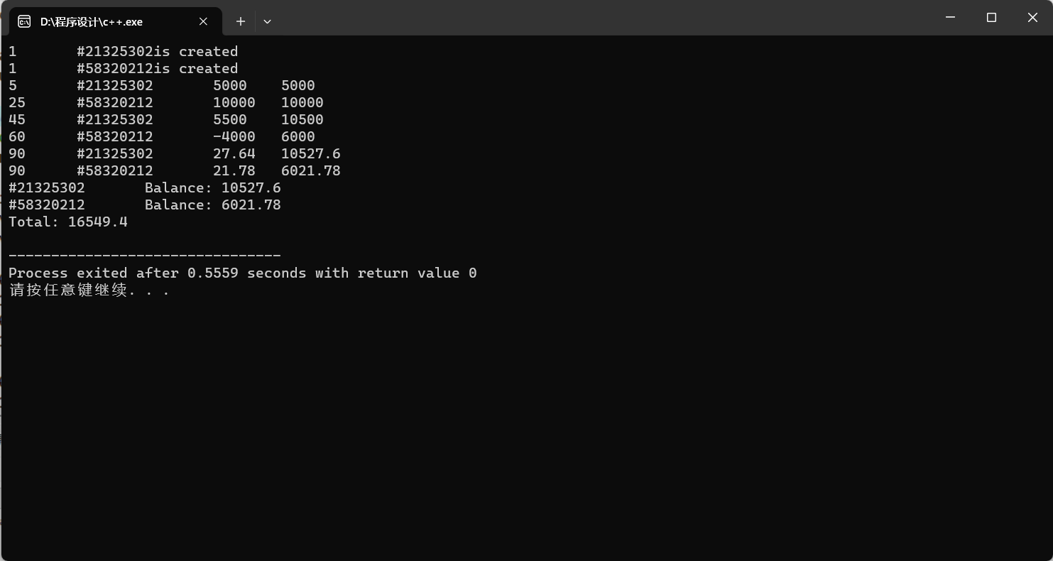 1 #include "account.cpp" 2 #include <iostream> 3 using namespace std; 4 5 int main() { 6 SavingsAccount sa0(1, 21325302, 0.015); 7 SavingsAccount sa1(1, 58320212, 0.015); 8 9 sa0.deposit(5,5000); 10 sa1.deposit(25,10000); 11 sa0.deposit(45,5500); 12 sa1.withdraw(60,4000); 13 14 sa0.settle(90); 15 sa1.settle(90); 16 17 sa0.show(); cout << endl; 18 sa1.show(); cout << endl; 19 cout << "Total: " << SavingsAccount::getTotal() << endl; 20 return 0; 21 }