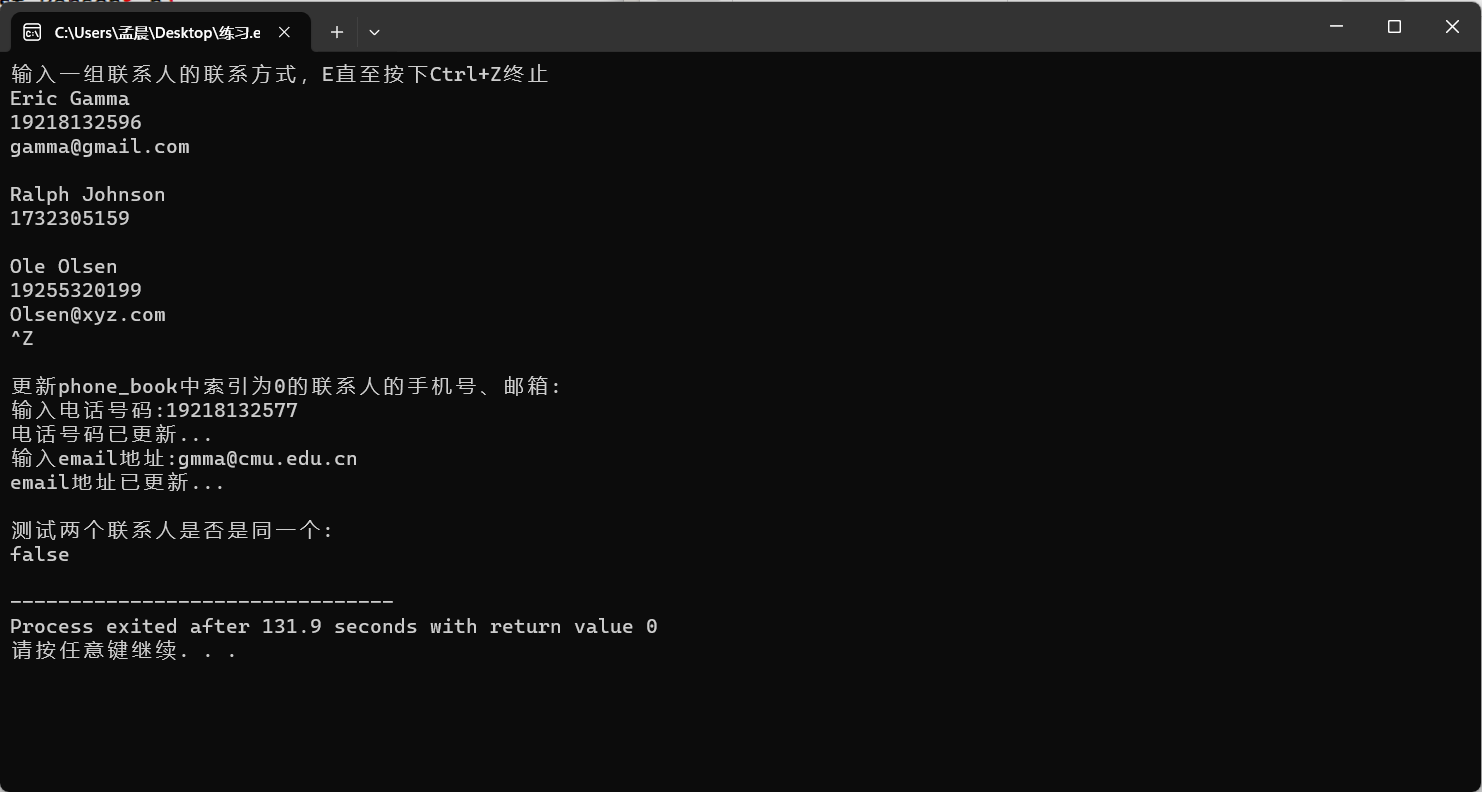 1 #include <iostream> 2 #include <vector> 3 #include "Person.hpp" 4 void test() 5 { 6 using namespace std; 7 8 vector<Person> phone_book; 9 Person p; 10 11 cout << "输入一组联系人的联系方式,E直至按下Ctrl+Z终止\n"; 12 while(cin >> p) 13 phone_book.push_back(p); 14 15 cout << "\n更新phone_book中索引为0的联系人的手机号、邮箱:\n"; 16 phone_book.at(0).update_telephone(); 17 phone_book.at(0).update_email(); 18 19 cout << "\n测试两个联系人是否是同一个:\n"; 20 cout << boolalpha << (phone_book.at(0) == phone_book.at(1)) << endl; 21 } 22 int main() 23 { 24 test(); 25 }
