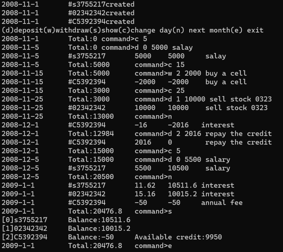 1 #include"account.h" 2 #include<iostream> 3 using namespace std; 4 int main() 5 { 6 Date date(2008, 11, 1); 7 SavingsAccount sa1(date, "s3755217", 0.015); 8 SavingsAccount sa2(date, "02342342", 0.015); 9 CreditAccount ca(date, "C5392394", 10000, 0.0005, 50); 10 Account* accounts[] = { &sa1,&sa2,&ca }; 11 const int n = sizeof(accounts) / sizeof(Account*); 12 cout << "(d)deposit(w)withdraw(s)show(c)change day(n) next month(e) exit" << endl; 13 char cmd; 14 do { 15 date.show(); 16 cout << "\tTotal:" << Account::getToal() << "\tcommand"; 17 int index, day; 18 double amount; string desc; 19 cin >> cmd; 20 switch (cmd) 21 { 22 case'd': 23 cin >> index >> amount; 24 getline(cin, desc); 25 accounts[index]->deposit(date, amount, desc); 26 break; 27 case'w': 28 cin >> index >> amount; 29 getline(cin, desc); 30 accounts[index]->withdraw(date, amount, desc); 31 break; 32 case's': 33 for (int i = 0; i < n; i++) 34 { 35 cout << "[" << i << "]"; 36 accounts[i]->show(); 37 cout << endl; 38 } 39 break; 40 case'c': 41 cin >> day; 42 if (day << date.getDay()) 43 cout << "You cannot specify a previous day"; 44 else if (day > date.getMaxDay()) 45 cout << "Invalid day"; 46 else 47 date = Date(date.getYear(), date.getMonth(), day); 48 break; 49 case'n': 50 if (date.getMonth() == 12) 51 date = Date(date.getYear() + 1, 1, 1); 52 else 53 date = Date(date.getYear(), date.getMonth() + 1, 1); 54 for (int i = 0; i < n; i++) 55 accounts[i]->settle(date); 56 break; 57 } 58 } while (cmd != 'e'); 59 return 0; 60 }
