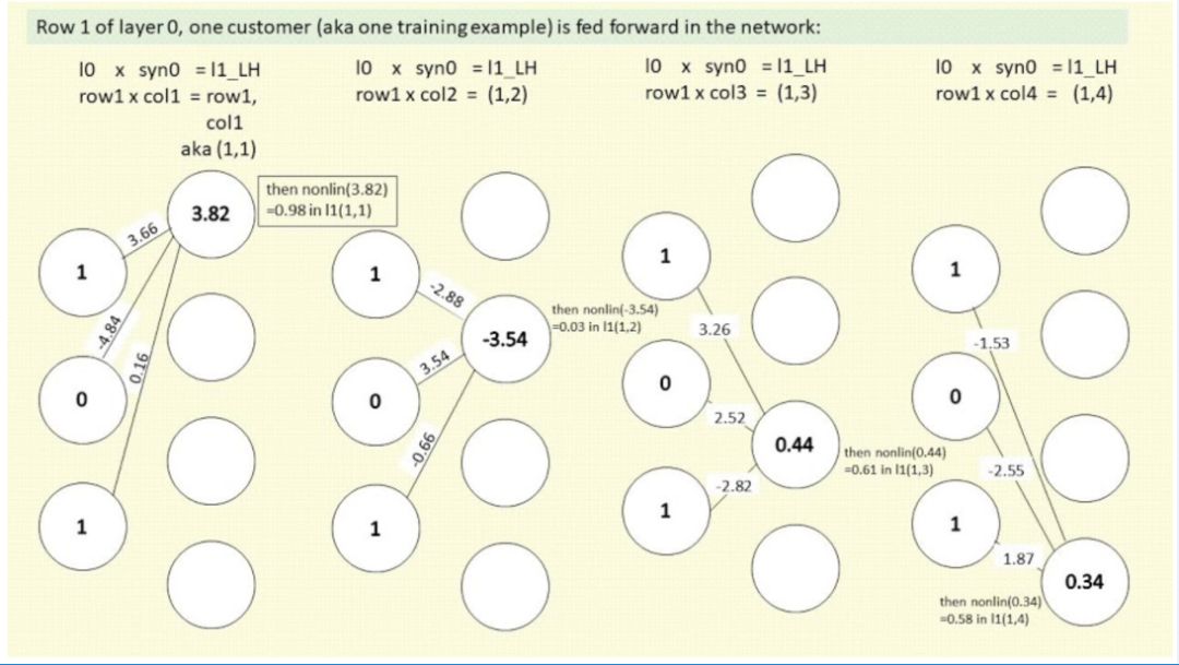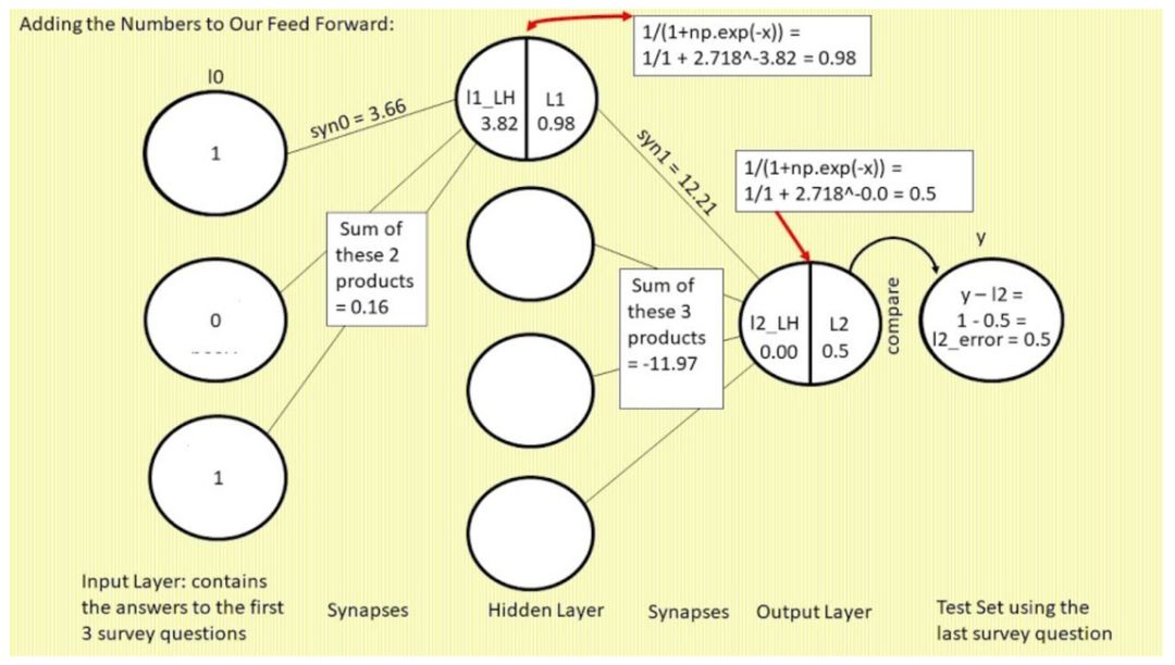前馈:想象一下 1960 年的 IBM 计算机,大到填满整个房间,穿孔卡片从一端输入,答案从另一端输出。上文提到的神经网络以前三个调查问题的数据作为输入,得出预测结果;