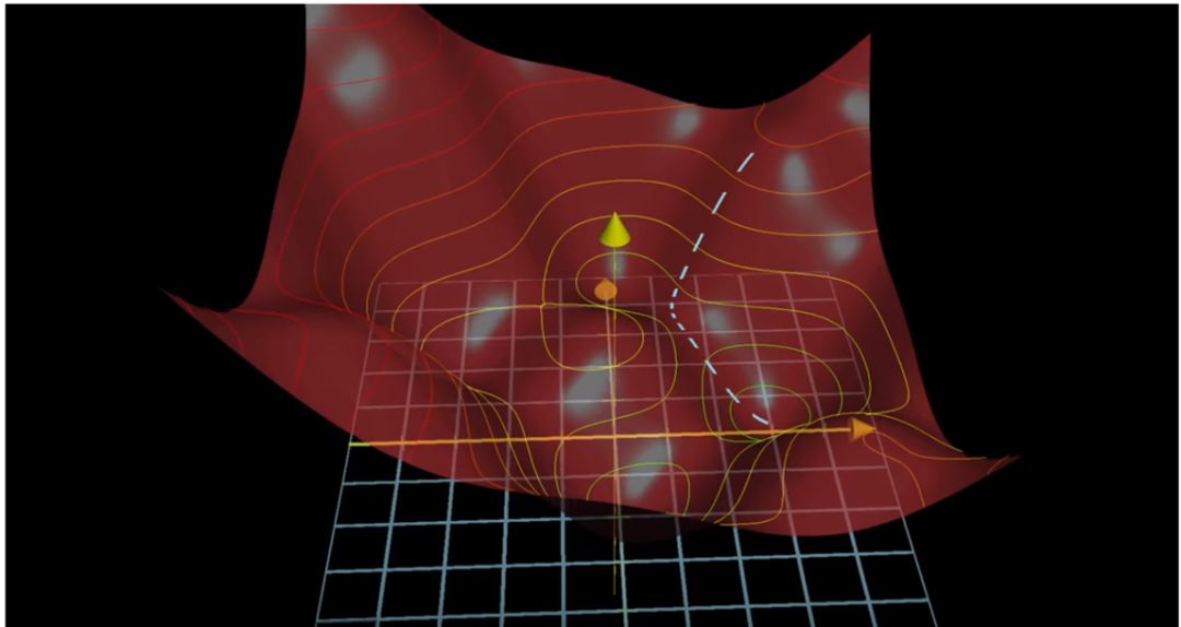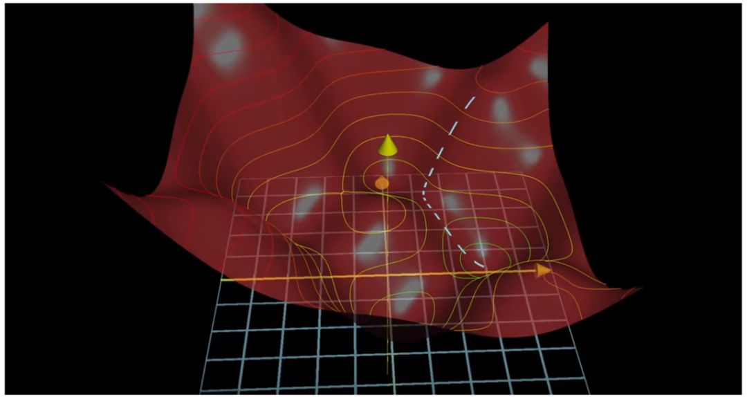 总之,红色碗表面上每一个红点表示网络使用特定问题组合和权重组合进行的一次试验。每一个凹陷表示「这一步走在了正确的道路上」,网络注意到这一点并将继续保持。每一个凸起处表示「这一步走错了方向」,网络也会注意到并摒弃它。预测球的路径(白色虚线)歪歪扭扭,是因为预测球在通往碗底的路上不断寻找凹陷处、避免凸起处。你可以说白色虚线是预测球通往碗底的最高效路径。