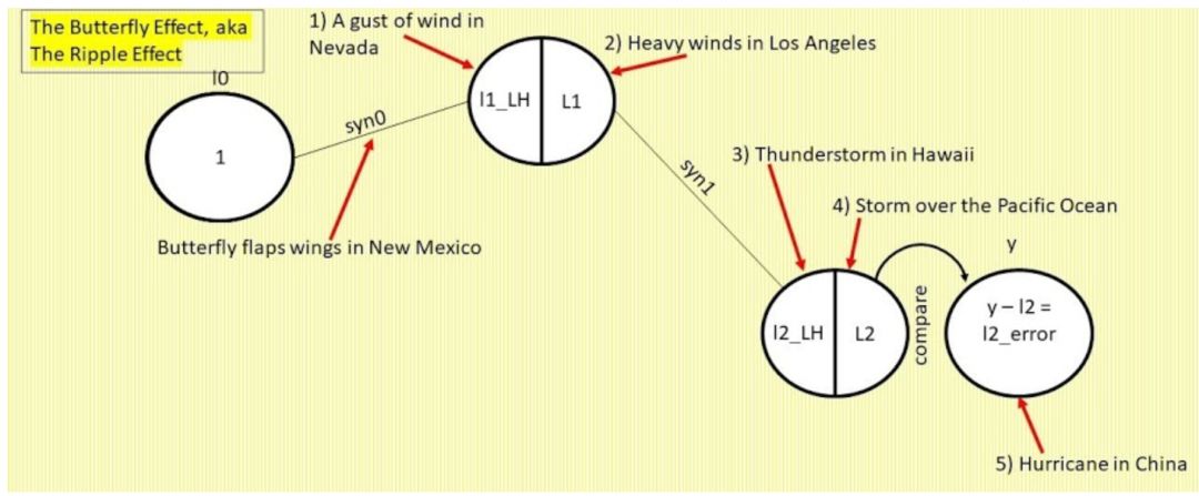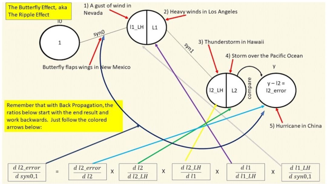 倒过来看,我们可以说「飓风 l2_error 的变化取决于 l2 的变化,l2 的变化取决于 l2_LH 的变化,l2_LH 的变化取决于 l1 的变化,l1 的变化取决于 l1_LH 的变化,而 l1_LH 的变化取决于蝴蝶 syn0,1 的变化」。该示例中所用的规则即步长等于坡度。