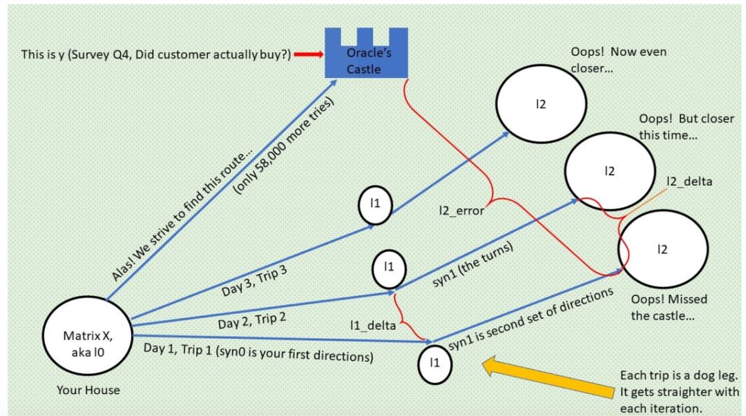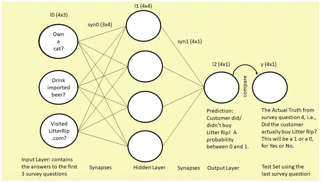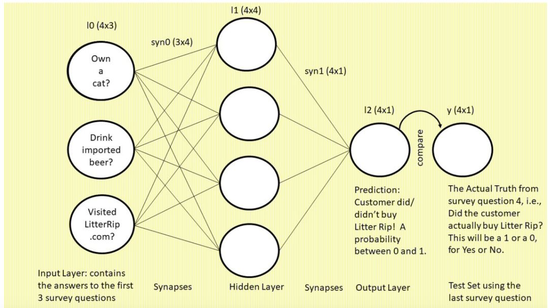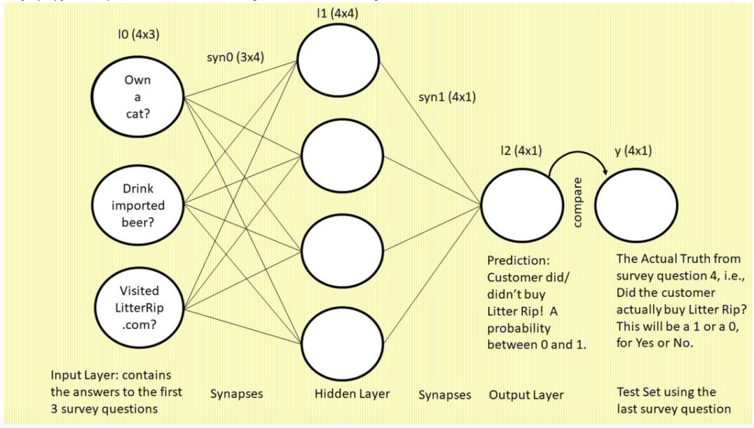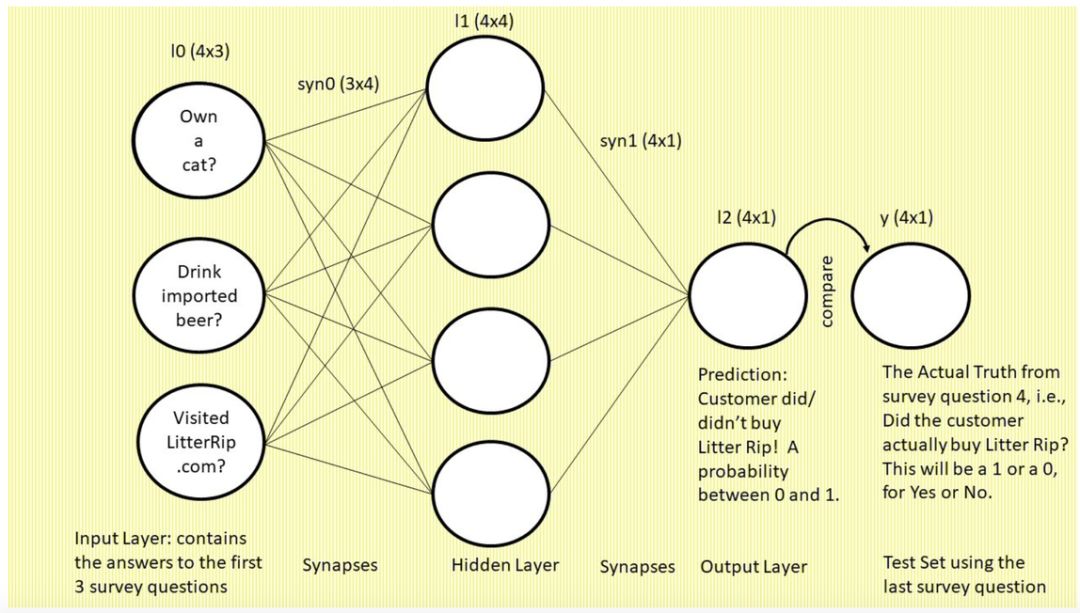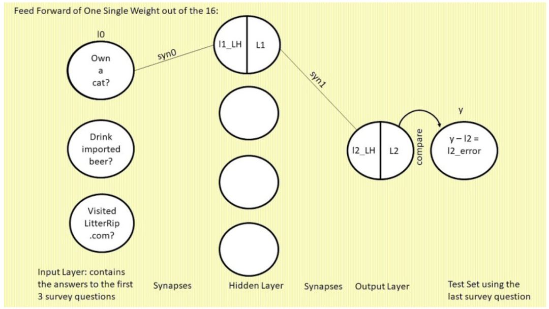 最右侧标注「y」的单个圆圈表示真值,即每个顾客对第四个调查问题「你是否购买过 Litter Rip! 猫砂?」的回答。这个圆圈有两个选择:0 表示没买过,1 表示买过。神经网络将输出一个预测概率,并将其与 y 进行对比,查看准确率,然后在下一次迭代中吸取教训。神经网络在数秒时间内可以完成数万次试错。