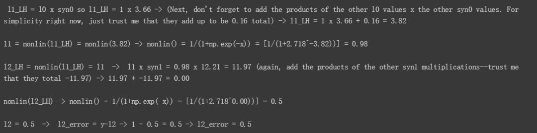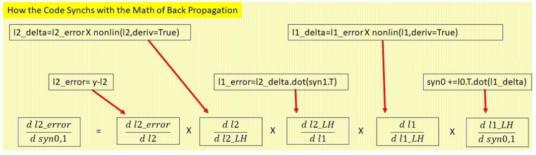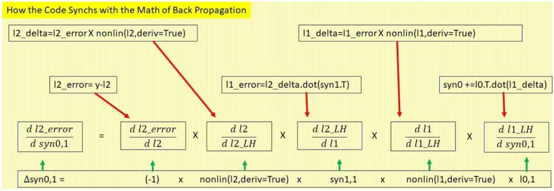 下面,我们看看改变 syn0 中一个权重的数学背景。出于简便,这里的变量和第 3 节相同: