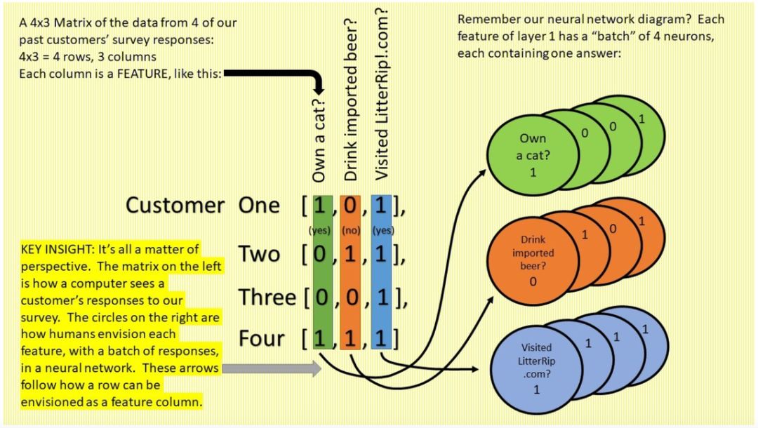 首先,你需要将之前顾客的调查数据和他们对前三个问题的回答输入到网络中,进行训练。该网络使用这些数据预测某位顾客是否确实购买了新款猫砂。然后网络再将预测结果与顾客第四个问题的答案进行对比。第四个问题的答案就是标签,作为事实供网络进行对比。例如,如果网络预测结果是「是的,我认为这位顾客买过 Litter Rip! 猫砂」,而这位顾客第四个问题的答案确实是「Yes」,那么你就拥有了一个成功的神经网络。