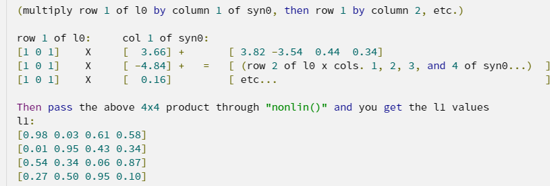 学习:网络使用置信度(梯度下降)找出下一次迭代需要在正确的方向上做出多少改变,即 delta。然后网络使用新的 delta,并将它乘以旧的 l1 或 l2,然后将乘积加在旧的 syn0 或 syn1 上。你明白为什么说突触是神经网络的大脑了吗?它们在试错中学习,和人类一样。