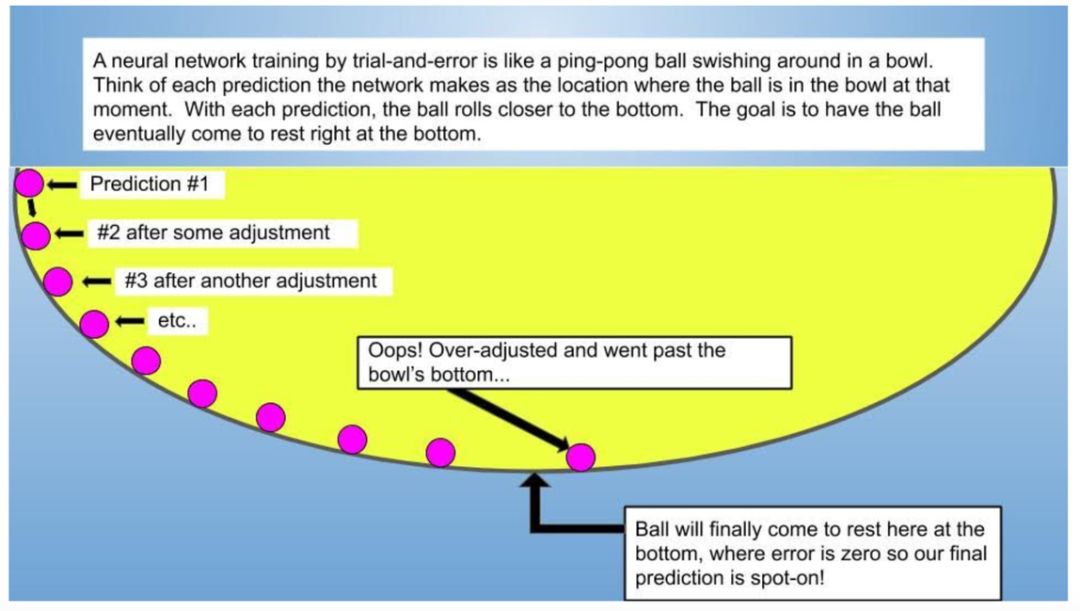 梯度下降是网络在达到准确预测(即全局最小误差)前的试错过程,就像乒乓球滚落碗底的过程;