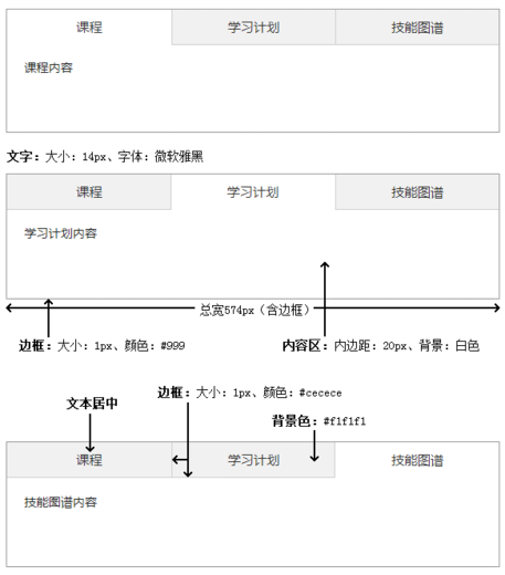 1 <!DOCTYPE html> 2 <html lang="en"> 3 <head> 4 <meta charset="UTF-8"> 5 <title>Tab</title> 6 <style type="text/css"> 7 html{ 8 height: 100%; 9 } 10 body{ 11 display: flex; 12 flex-flow: column; 13 box-sizing: border-box; 14 width: 574px; 15 height: 100%; 16 border:1px solid #999; 17 } 18 .charactor{ 19 font:14px "微软雅黑"; 20 } 21 .content{ 22 padding: 20px; 23 background-color: white; 24 flex: 1; 25 display: flex; 26 } 27 .nav{ 28 display: flex; 29 } 30 .item{ 31 text-align: center; 32 border:1px solid #cecece; 33 background-color: #f1f1f1; 34 flex-grow: 1; 35 padding: 10px; 36 } 37 .item1{ 38 background-color: white; 39 border:none; 40 } 41 </style> 42 </head> 43 <body> 44 <div class="nav"> 45 <div class="item item1 charactor">课程</div> 46 <div class="item item2 charactor">学习计划</div> 47 <div class="item item3 charactor">技能图谱</div> 48 </div> 49 <div class="content charactor">课程内容</div> 50 </body> 51 </html>
