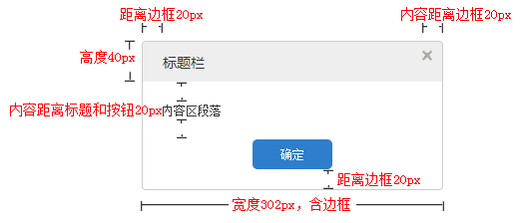 总体:弹窗相对于浏览器窗口固定(即滚动条拖动时不影响弹窗位置)且水平垂直居中,弹窗总宽度302px,高度未知(由内容区的内容决定),圆角半径为5px,边框为1px的实线,边框颜色为#cccccc。
