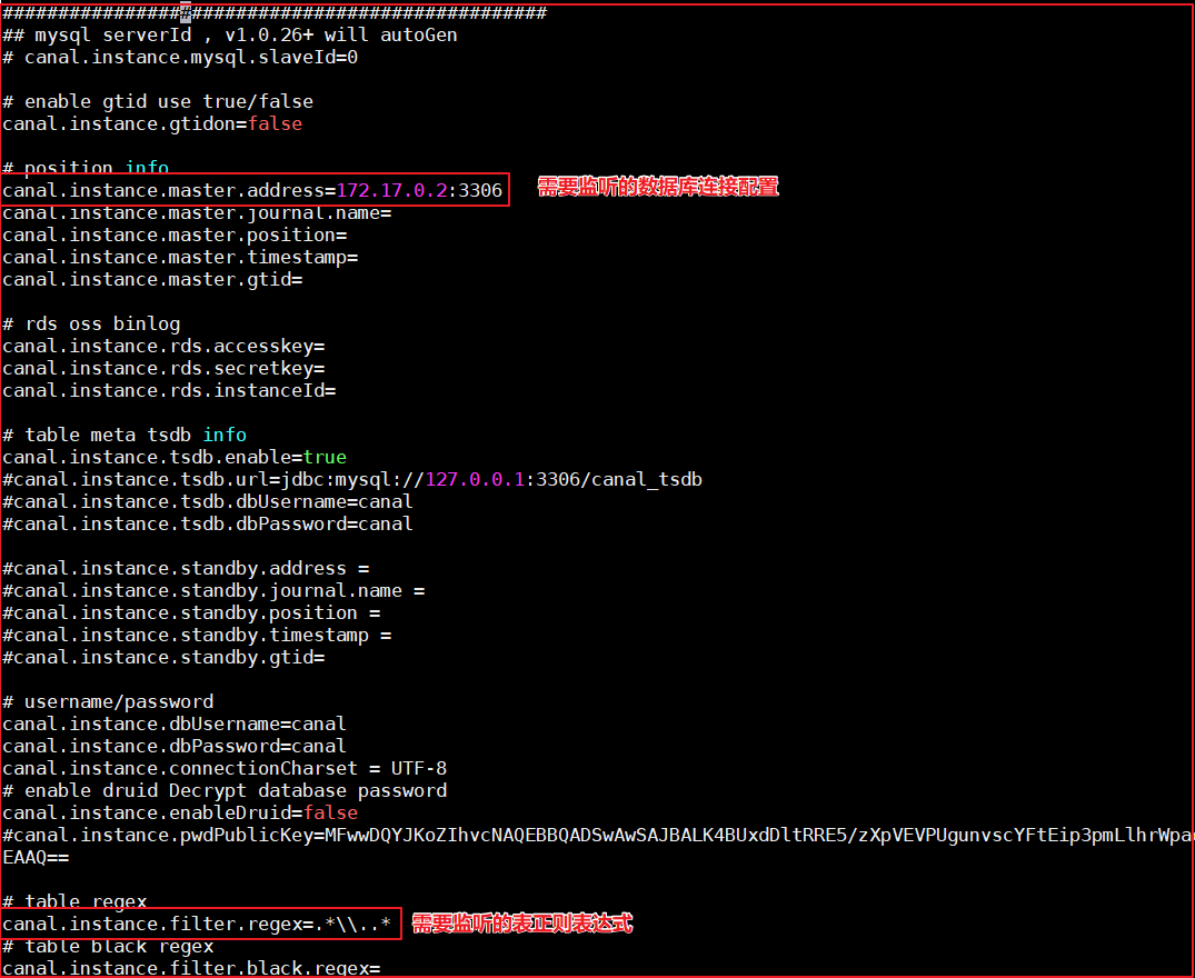 canal.properties 是canal自身的配置,instance.properties是需要同步数据的数据库连接配置。