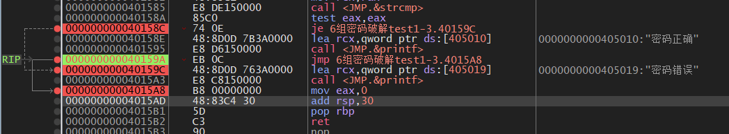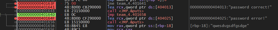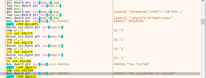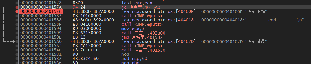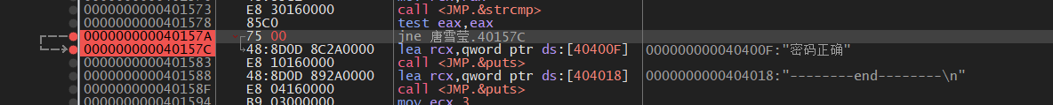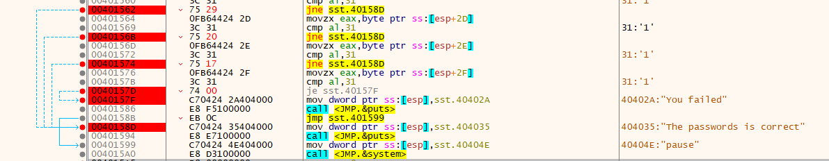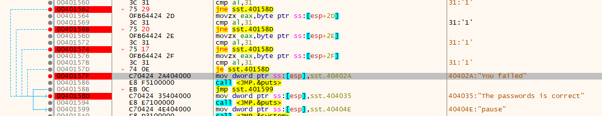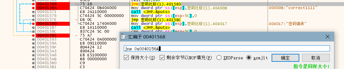 把每一个字符的jne否定跳转全部指向 0x 0040158d 这个地址 实现所有密码都返回正确