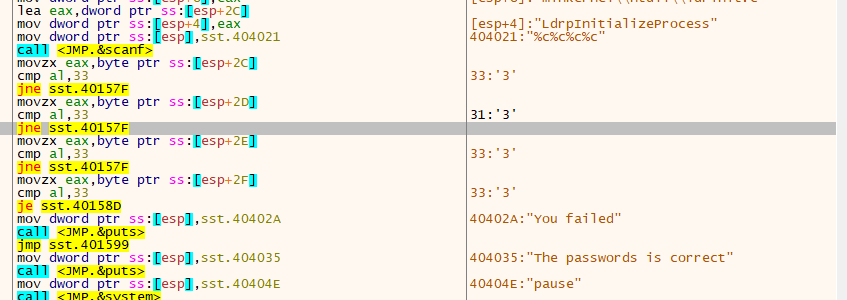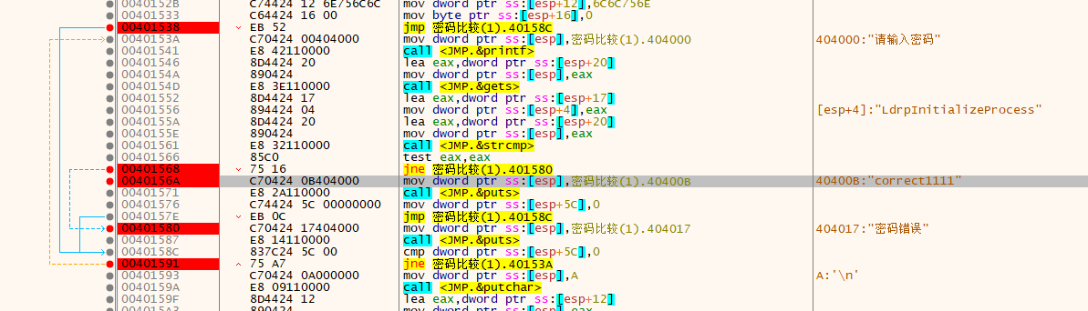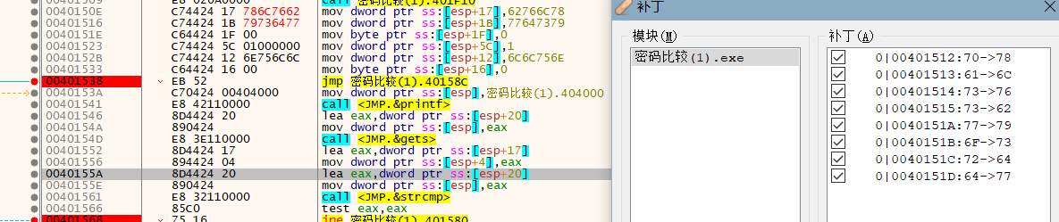 把每一个字符的jne否定跳转全部指向 0x 0040158d 这个地址 实现所有密码都返回正确