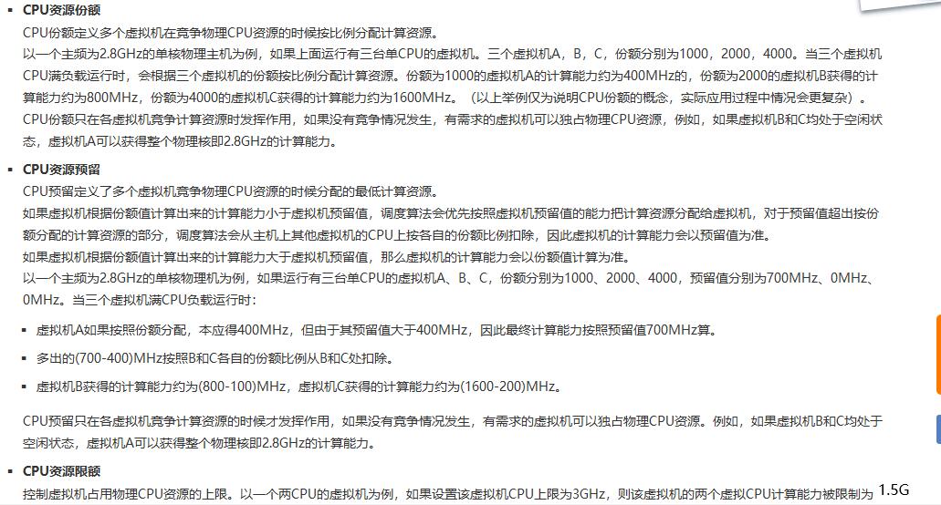 cpu与内存的资源份额,资源预留,资源限制三个通用关系举例:资源份额就比如一个箱子里有10个苹果,主人让三人按份额固定分配自己,分配给老大的是6个苹果,老二的是2个苹果,老三的也是2个苹果。那么此时老大老二老三的份额比是3:1:1,如果有其他水果,例如20根香蕉。那么也是按此比例固定分配得到的是老大12根香蕉,老二4根香蕉,老三4根香蕉。而资源预留可以打破固定份额,就好比如主人说今天开始老二最少分配30%,那么10个苹果老二最少分配3个苹果,剩余7个苹果,按照原来的老大和老三的份额比例3:1分配,大概分配是老大是5个苹果,老三是2个苹果。而资源限制呢,就好比如,突然有一天主人说,老二你以后分配最多不能超过10%,老二就纳闷了说,你不是说我最少分配30%吗?现在不行了,你要按我现在所说的做,不准违背!那么10个苹果老二只能得到1个苹果,剩余9个按3:1分配给老大老三。大概分配是老大7个苹果,老三2个苹果。由此得出结论:三者的权限为资源限制>资源预留>资源份额。