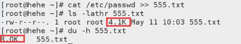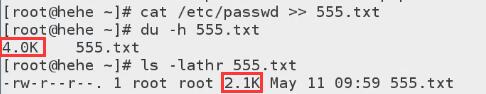 555.txt文件使用大小为2.1k,而实际占用却为4k,第二次写入相同大小文件已使用大小为4.1k,而实际占用为8k 这就是最小分配单位