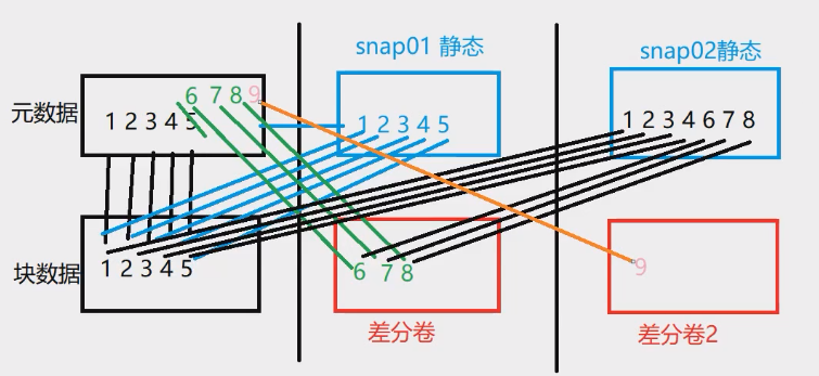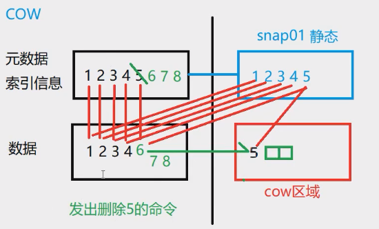 拍摄第一个快照snap01,会创建一个cow区域(lvm磁盘空间),当你删除数据5的时候,会把5提前复制到cow区域,快照元数据的指针从原本指向源磁盘数据中的5,重新指向了cow区域中的5,而源磁盘的元数据指针更改为6。当你新增数据7和8时,7和8所对应的空块也会拷贝在快照的cow区域中。所以cow区域所占用的空间会随着原来数据的新增删改而原来越大。