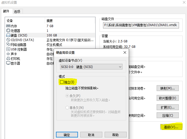 磁盘模式(从属、独立持久、独立非持久主要是对快照有影响):