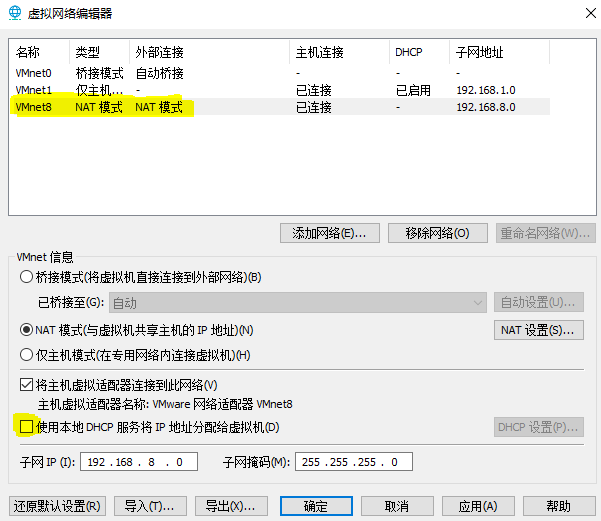服务器采用NAT模式,由于服务器也要充当DHCP,所以把VMware中的NAT模式的DHCP服务取消掉